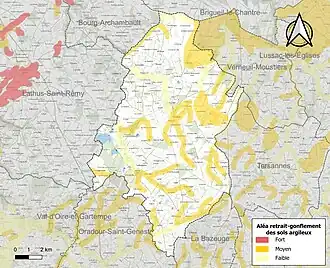 Le retrait-gonflement des sols argileux est susceptible d'engendrer des dommages importants aux bâtiments en cas d'alternance de périodes de sécheresse et de pluie[17]. 22,1 % de la superficie communale est en aléa moyen ou fort (27 % au niveau départemental et 48,5 % au niveau national métropolitain)[Carte 2]. Depuis le , en application de la loi ÉLAN, différentes contraintes s'imposent aux vendeurs, maîtres d'ouvrages ou constructeurs de biens situés dans une zone classée en aléa moyen ou fort[Note 3],[18].