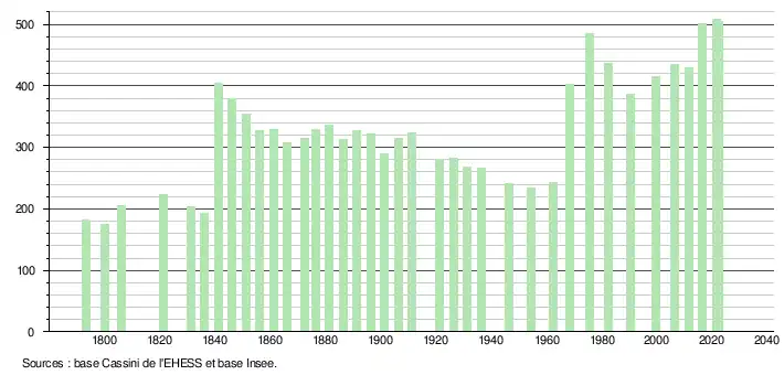 L'évolution du nombre d'habitants est connue à travers les recensements de la population effectués dans la commune depuis 1793. Pour les communes de moins de 10 000 habitants, une enquête de recensement portant sur toute la population est réalisée tous les cinq ans, les populations de référence des années intermédiaires étant quant à elles estimées par interpolation ou extrapolation[52]. Pour la commune, le premier recensement exhaustif entrant dans le cadre du nouveau dispositif a été réalisé en 2006[53].