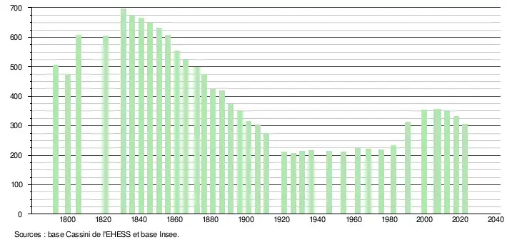 L'évolution du nombre d'habitants est connue à travers les recensements de la population effectués dans la commune depuis 1793. Pour les communes de moins de 10 000 habitants, une enquête de recensement portant sur toute la population est réalisée tous les cinq ans, les populations de référence des années intermédiaires étant quant à elles estimées par interpolation ou extrapolation[24]. Pour la commune, le premier recensement exhaustif entrant dans le cadre du nouveau dispositif a été réalisé en 2007[25].