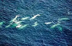 Le béluga est très sociable. Il se déplace en groupes subdivisés en sous-entités habituellement composées d'animaux du même âge et du même sexe. Les mères et leurs petits intègrent généralement des groupes restreints. Lorsque les nombreuses sous-entités se rejoignent dans les estuaires, il est possible de dénombrer des milliers d'individus ; ce qui représente une proportion significative de la population mondiale des bélugas et les rend d'autant plus vulnérables à la chasse.