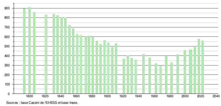L'évolution du nombre d'habitants est connue à travers les recensements de la population effectués dans la commune depuis 1793. Pour les communes de moins de 10 000 habitants, une enquête de recensement portant sur toute la population est réalisée tous les cinq ans, les populations de référence des années intermédiaires étant quant à elles estimées par interpolation ou extrapolation[22]. Pour la commune, le premier recensement exhaustif entrant dans le cadre du nouveau dispositif a été réalisé en 2007[23].