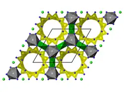 Dans les béryls alcalins, le lithium peut se substituer à l'aluminium en position octaédrique et l'aluminium peut se substituer en partie au béryllium en position tétraédrique. L’équilibre électrique de la structure est réalisé par introduction d'ions sodium ou césium dans les canaux de la structure.