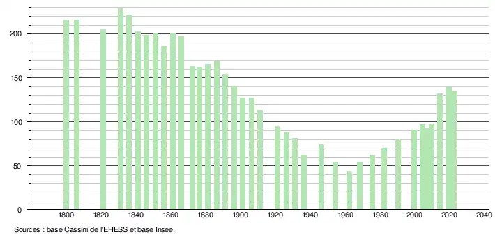 L'évolution du nombre d'habitants est connue à travers les recensements de la population effectués dans la commune depuis 1800. Pour les communes de moins de 10 000 habitants, une enquête de recensement portant sur toute la population est réalisée tous les cinq ans, les populations de référence des années intermédiaires étant quant à elles estimées par interpolation ou extrapolation[12]. Pour la commune, le premier recensement exhaustif entrant dans le cadre du nouveau dispositif a été réalisé en 2004[13].