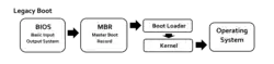 - il démarre le système d'exploitation dans l'ordre croissant des périphériques disponibles, en contenant une fonction dite d'amorçage, ou en anglais : bootstrap).