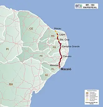 La BR-104 est une route fédérale du Brésil. Son point de départ se situe à Macau, dans l'État du Rio Grande do Norte, et elle s'achève à Maceió, dans l'État de l'Alagoas. Elle traverse les États du Rio Grande do Norte, de la Paraíba, du Pernambouc et de l'Alagoas.