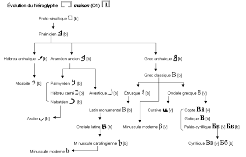 La lettre B tire probablement son origine de l'alphabet proto-sinaïtique, un alphabet utilisé dans le Sinaï il y a plus de 3 500 ans, lui-même dérivé des hiéroglyphes égyptiens ; le son, /b/, était alors représenté par une maison.