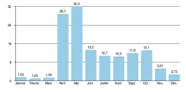 Le débit moyen mensuel observé en février (minimum d'étiage) est de 1,00 m3/s, soit un peu plus de 3 % du débit moyen du mois de mai (32 m3/s), ce qui souligne l'amplitude très élevée des variations saisonnières. Ces écarts de débit mensuel peuvent encore être plus marqués d'après les années. Ainsi sur la durée d'observation de 17 ans, le débit mensuel minimal relevé a été de 0,18 m3/s en , tandis que le débit mensuel maximal s'élevait à 566 m3/s en .