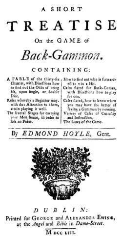 En 1743, Edmond Hoyle publie A Short Treatise on the Game of Back-Gammon[7] relié avec un traité du whist. Plus qu'un livre de règles du jeu, il s'agit d'un traité présentant des stratégies, tactiques, ouvertures et probabilités. À ce traité sont ajoutées cinq lois codifiant l'utilisation des pions, par exemple, « dame levée, dame jouée ». Le backgammon présenté par Edmond Hoyle ne diffère pas du toute-table.