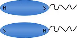 Or, le champ magnétique de la Terre étant incliné sous l’horizontale dans l’hémisphère nord, et au-dessus dans l’hémisphère sud, les bactéries qui suivent les lignes de champ en s'approchant de l'un des pôles ont tendance à "descendre". Elles migrent donc en s’enfonçant dans les sédiments le long des lignes de champ géomagnétique[4]. En regardant un schéma du champ magnétique terrestre (voir exemple ci-contre), on observe que les lignes de champ magnétique partent du noyau de la Terre, se dirigent vers le sud, puis partent vers le nord en formant des arcs de cercle avant de finalement revenir au noyau. De ce fait, lorsque les bactéries magnétotactiques au nord suivent les lignes de champ vers son pôle, elles ont tendance à s'enfoncer. Au sud, elles vont dans le sens contraire, et s'enfoncent par conséquent sous les sédiments.