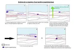 En effet, elles utilisent aussi l’aérotaxie, c'est-à-dire qu’elles migrent en fonction de la concentration en oxygène, et pas seulement par rapport aux lignes de champ magnétique. Par exemple, lorsqu’une bactérie magnétotactique utilise la magnétotaxie, elle s’enfonce sous les sédiments jusqu'à trouver un milieu avec la bonne teneur en oxygène et s’y fixe[7]. Le problème est que parfois les colonnes sédimentaires (voir schéma ci-contre), qui possèdent de forts gradients rédox, subissent une érosion ou d’autres phénomènes qui ont pour conséquence la remontée vers la surface des sédiments, et donc par exemple de bactéries magnétotactiques qui y vivent. Étant donné l’évolution de la concentration en oxygène en fonction de la profondeur, une bactérie magnétotactique qui est remontée vers la surface avec les sédiments ne se trouve plus dans un milieu de concentration en oxygène optimale.