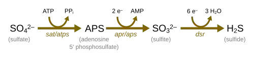 Avant que le sulfate puisse être utilisé comme accepteur d'électrons, il doit être activé. Cela est fait par l'enzyme ATP-sulfurylase, qui utilise l'ATP et le sulfate pour créer l'adénosine 5'-phosphosulfate (APS). L'APS est ensuite réduite en sulfite et en AMP. Le sulfite est ensuite encore réduit en sulfure, tandis que l'AMP est transformée en ADP en utilisant une autre molécule d'ATP. Le processus global implique donc un investissement de deux molécules du vecteur énergétique ATP, qui devront être récupérées de la réduction[1].