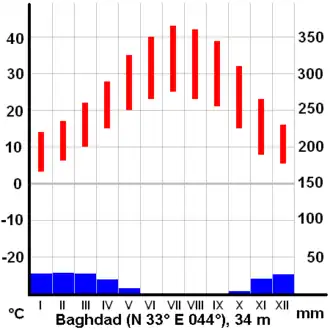 Le climat désertique de Bagdad en fait l'une des plus chaudes régions du monde pendant l'été, surtout quand le vent du golfe Persique souffle (on atteint environ 45 °C en juillet). En hiver, la pluviosité est de 136 mm[7] et le thermomètre oscille en moyenne entre 6 et 18 °C en décembre, et entre 4 et 16 °C en janvier. Il y a une douzaine de jours de gel par an, avec des températures parfois assez basses (minimum de −6 °C)[8].