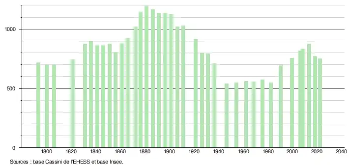 - ↑ Fiches Insee - Populations de référence de la commune pour les années 2006, 2007, 2008, 2009, 2010, 2011, 2012, 2013, 2014, 2015, 2016, 2017, 2018, 2019, 2020, 2021 et 2022.