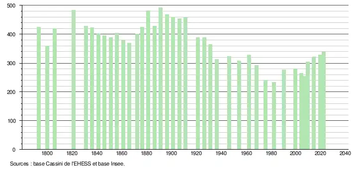 L'évolution du nombre d'habitants est connue à travers les recensements de la population effectués dans la commune depuis 1793. Pour les communes de moins de 10 000 habitants, une enquête de recensement portant sur toute la population est réalisée tous les cinq ans, les populations de référence des années intermédiaires étant quant à elles estimées par interpolation ou extrapolation[20]. Pour la commune, le premier recensement exhaustif entrant dans le cadre du nouveau dispositif a été réalisé en 2004[21].