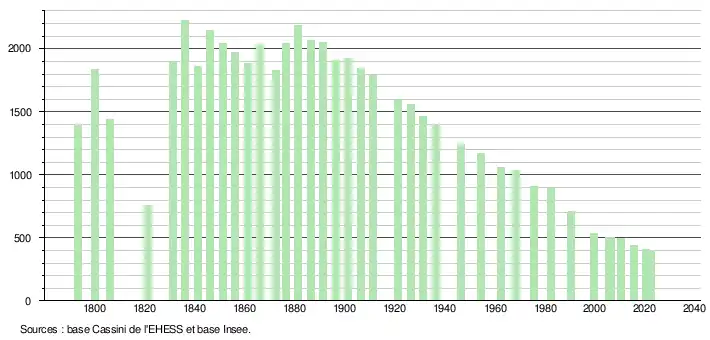 L'évolution du nombre d'habitants est connue à travers les recensements de la population effectués dans la commune depuis 1793. Pour les communes de moins de 10 000 habitants, une enquête de recensement portant sur toute la population est réalisée tous les cinq ans, les populations de référence des années intermédiaires étant quant à elles estimées par interpolation ou extrapolation[22]. Pour la commune, le premier recensement exhaustif entrant dans le cadre du nouveau dispositif a été réalisé en 2005[23].