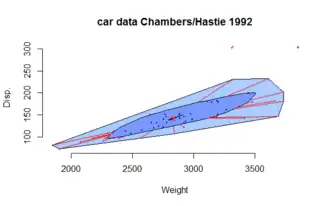 Les observations qui ne sont pas marquées comme aberrantes sont entourées d'une boucle, l'enveloppe convexe des observations à l'intérieur de la clôture[6].
