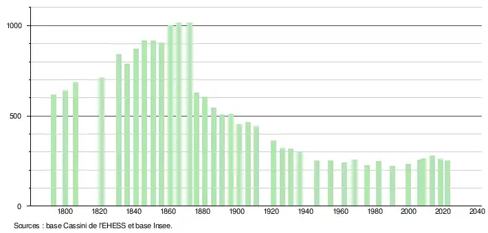 L'évolution du nombre d'habitants est connue à travers les recensements de la population effectués dans la commune depuis 1793. Pour les communes de moins de 10 000 habitants, une enquête de recensement portant sur toute la population est réalisée tous les cinq ans, les populations de référence des années intermédiaires étant quant à elles estimées par interpolation ou extrapolation[27]. Pour la commune, le premier recensement exhaustif entrant dans le cadre du nouveau dispositif a été réalisé en 2008[28].