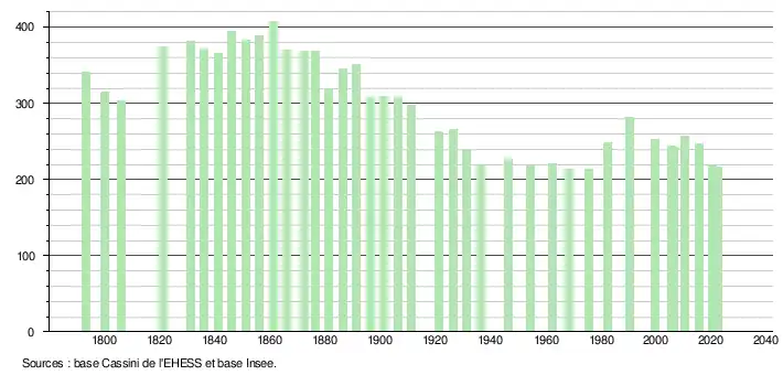 L'évolution du nombre d'habitants est connue à travers les recensements de la population effectués dans la commune depuis 1793. Pour les communes de moins de 10 000 habitants, une enquête de recensement portant sur toute la population est réalisée tous les cinq ans, les populations de référence des années intermédiaires étant quant à elles estimées par interpolation ou extrapolation[28]. Pour la commune, le premier recensement exhaustif entrant dans le cadre du nouveau dispositif a été réalisé en 2005[29].