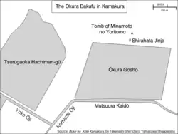 « Il y a 820 ans en 1180, Minamoto no Yoritomo construit ici sa résidence. Après avoir consolidé son pouvoir, c'est d'ici qu'il gouverne et son gouvernement est pour cela appelé bakufu Ōkura. Ses fils Yoriie et Sanetomo lui succèdent et cet endroit reste le siège du gouvernement pendant 46 ans, jusqu'à la mort de son épouse Hōjō Masako en 1225. Il est alors transféré au Utsunomiya Tsuji (宇津宮辻).