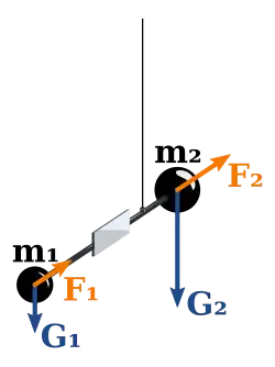 Une tige légère de 40 cm porte à chaque extrémité une boule d'environ 30 g. Elle est suspendue en son milieu par un fil de platine très mince d'environ 60 cm. Si les verticales passant par les centres de gravité des boules sont bien parallèles et dans le même plan que celui de la tige et du fil, alors la tige ne tourne pas, mais si les deux verticales ne sont pas dans le même plan, alors le fil se tord et un équilibre s'établit[2].
