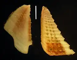 * de l’existence sur les scutum d’un quadrillage délimitant de profondes dépressions[1]. Ce caractère peut ne pas être immédiatement apparent car les scutum sont revêtus d’une cuticule hérissée de cils qui retiennent des particules et permettent le fixation d’épibiontes divers.