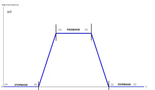 Réponse en fréquence d'un exemple de filtre passe-bande. Les fréquences entre une bande d'arrêt (en anglais : stopband) et une bande passante définissent la bande de transition (en anglais : passband).