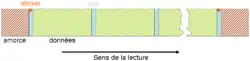Les premiers mètres de bande sont appelés l'« amorce ». L'amorce est terminée par une étiquette réfléchissante (appelée « sticker ») collée sur la bande. Un dispositif de détection photoélectrique sur le dérouleur de bandes détecte cette étiquette qui délimite le début de la zone de données et termine l'étape de « chargement » de la bande. Une seconde étiquette est positionnée à la fin de la bande, et marque la fin de la zone de données. Afin de distinguer les deux, le sticker de début de bande est situé sur la partie supérieure de la bande tandis que celui de fin de bande est situé sur la partie inférieure. Typiquement, quand celle-ci est détectée par le lecteur, il rembobine la bande automatiquement.