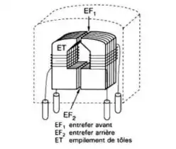 Exemple de réalisation : tête audiophonique. Ces têtes, très bon marché, sont généralement réalisées par empilement de tôles en fer doux pour réduire les courants induits dans le milieu magnétique (courants de Foucault). La résolution est faible (entrefer de 2 à 10 µm), la masse de cuivre du bobinage est très importante pour permettre la reproduction des basses fréquences.