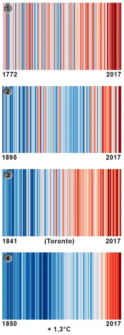 - 1 2 (en) Ed Hawkins, « Warming stripes », sur Climate Lab Book, (consulté le ).
