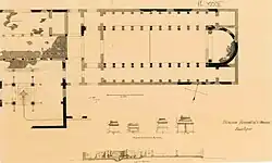 L'église est orienté est-nord-est, mesurant 48,95 mètres sur 21,40 mètres avec son vestibule de 41 mètres sur 21 mètres[A 4]. Le chevet est constitué d'une abside semi-circulaire de 9,20 mètres sur 7,35 mètres de profondeur et surélevée de trois marches par rapport au reste de l'édifice. Des sacristies sont sans doute présentes selon les fouilleurs du début du XXe siècle[A 4].