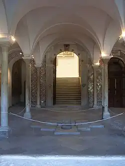 Un vestibule situé devant l'édifice donne accès à la basilique, à une salle munie de portiques et de mosaïques, et au baptistère. L'ensemble devant l'église stricto sensu mesure 19 mètres sur 33,10 mètres[A 4]. La salle à portiques comporte six colonnes et un accès ouvert dans le mur nord[A 3].