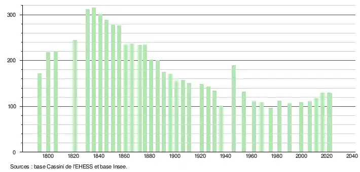 L'évolution du nombre d'habitants est connue à travers les recensements de la population effectués dans la commune depuis 1793. Pour les communes de moins de 10 000 habitants, une enquête de recensement portant sur toute la population est réalisée tous les cinq ans, les populations de référence des années intermédiaires étant quant à elles estimées par interpolation ou extrapolation[27]. Pour la commune, le premier recensement exhaustif entrant dans le cadre du nouveau dispositif a été réalisé en 2006[28].