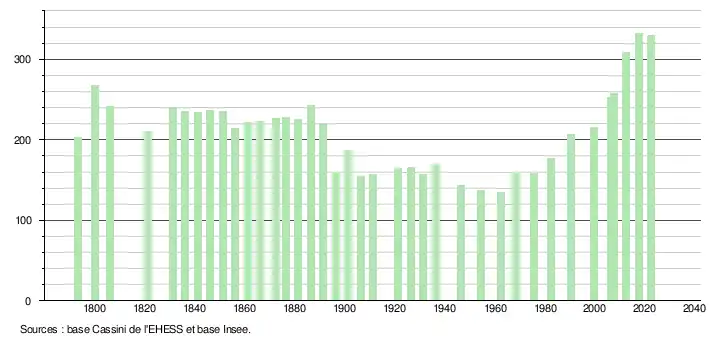 L'évolution du nombre d'habitants est connue à travers les recensements de la population effectués dans la commune depuis 1793. Pour les communes de moins de 10 000 habitants, une enquête de recensement portant sur toute la population est réalisée tous les cinq ans, les populations de référence des années intermédiaires étant quant à elles estimées par interpolation ou extrapolation[30]. Pour la commune, le premier recensement exhaustif entrant dans le cadre du nouveau dispositif a été réalisé en 2007[31].