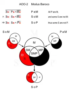 Un syllogisme en Baroco consiste en une proposition du type : Tout P est S, or quelques F ne sont pas S, donc quelques F ne sont pas P.