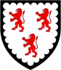 | Supports | À dextre, un faucon essorant d'argent bénit et membré d'or ; À sénestre, une levrette au naturel colletée de gueules bouclée d'or. |