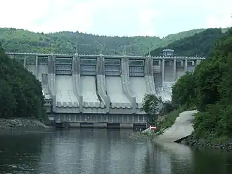 Le barrage est un barrage poids en béton dont le couronnement long de 260 mètres se trouve à 60 mètres au dessus de la rivière. Équipé de quatre déversoirs d'une largeur de 15 mètres, on peut grâce à ces ouvertures, en cas de pluies trop abondantes, maîtriser le niveau d'eau du lac de retenue et déverser jusqu’à 3 000 m3 d'eau par seconde. Le barrage sert à produire de l’électricité, à fournir de l’eau potable et non potable et à réguler le débit de la rivière. Le lac de retenue est utilisé pour des activités nautiques et de loisirs comme la pêche (achigan, anguille, brème, brochet, carcassin, carpe, gardon, perche, silure, tanche, "truite") mais très règlementée[1].