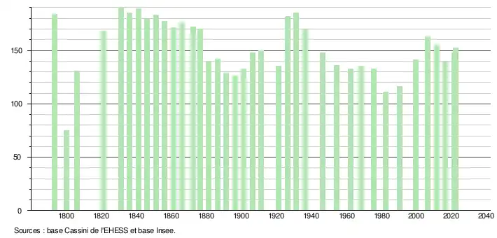 L'évolution du nombre d'habitants est connue à travers les recensements de la population effectués dans la commune depuis 1793. Pour les communes de moins de 10 000 habitants, une enquête de recensement portant sur toute la population est réalisée tous les cinq ans, les populations de référence des années intermédiaires étant quant à elles estimées par interpolation ou extrapolation[23]. Pour la commune, le premier recensement exhaustif entrant dans le cadre du nouveau dispositif a été réalisé en 2006[24].