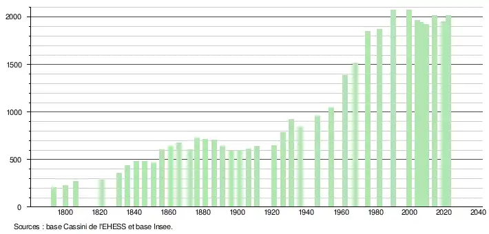 L'évolution du nombre d'habitants est connue à travers les recensements de la population effectués dans la commune depuis 1793. Pour les communes de moins de 10 000 habitants, une enquête de recensement portant sur toute la population est réalisée tous les cinq ans, les populations de référence des années intermédiaires étant quant à elles estimées par interpolation ou extrapolation[24]. Pour la commune, le premier recensement exhaustif entrant dans le cadre du nouveau dispositif a été réalisé en 2004[25].