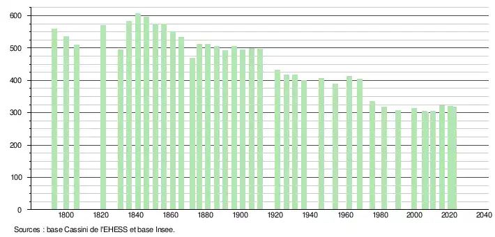 L'évolution du nombre d'habitants est connue à travers les recensements de la population effectués dans la commune depuis 1793. Pour les communes de moins de 10 000 habitants, une enquête de recensement portant sur toute la population est réalisée tous les cinq ans, les populations de référence des années intermédiaires étant quant à elles estimées par interpolation ou extrapolation[27]. Pour la commune, le premier recensement exhaustif entrant dans le cadre du nouveau dispositif a été réalisé en 2005[28].