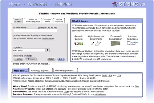Page d'accueil de la base de données biologiques STRING caractérisant les liens fonctionnels entre les protéines