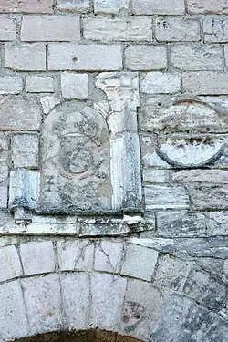 À l'entrée du bâtiment d'accueil qui abrite la boutique de la basilique, a été remontée la porte du fort, surmontée de l'écusson très abîmé de François Ier, c'est-à-dire les armes de France aux trois fleurs de lys avec au-dessous la salamandre[15]. Du côté droit de l'écusson, se trouve un rond de pierre rongé par le temps où l'on aperçoit quelques vestiges d'une sculpture qui représentait l'agneau de saint Jean avec la banderole[16].
