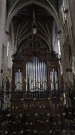 Les grandes orgues néogothiques (tribune) furent construites par le facteur d'orgues Joseph Merklin (société « Merklin-Schütze ») et inaugurées par Anton Bruckner. Cet orgue[24] fut récompensé par une médaille d'or à l'Exposition Universelle de Paris, en 1867 où il a été joué par la plupart des grands organistes parisiens[25]. Comme le reste de l'édifice, le dessin et l'architectonie du buffet ont été conçus par Prosper Morey[26].