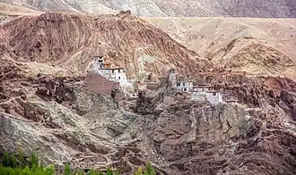 Le monastère a été construit par les souverains de Namgyal en [2]. Le souverain Delegs Namgyal (བདེ་ལེགས་རྣམ་རྒྱལ།) (1675-1705) ayant entrepris une expansion du territoire et la diffusion de sa lignée, entendait vouloir protéger son pays des armées mongoles du Tibet. Le monastère se situe stratégiquement au sommet d'une colline à 3 292 m d'altitude. Il surplombe les vestiges de la ville antique.