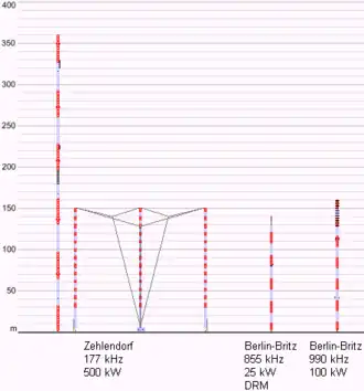 Deutschlandfunk Kultur Drapeau de l'Allemagne Zehlendorf grillage aérien sur un pylône haubané de 359,7 mètres et un triangle à 3 150 m sur des mâts haubanés en acier 500 kW Depuis le 29 août 2005, essais de 2h à 5h en DRM. Arrêt de la diffusion le 31 décembre 2014.