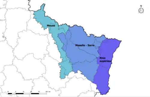 Le bassin comprend trois sous-bassins administratifs : Rhin supérieur, Moselle-Sarre et Meuse. Ils constituent un niveau intermédiaire d’agrégation entre la masse d'eau et le bassin Directive cadre de l'eau, à savoir le district hydrographique. Ils ont été mis en œuvre fin 2008 à la demande de la Commission européenne pour des objectifs de rapportage et de visualisation au sein de WISE (Water Information System for Europe)[3].
