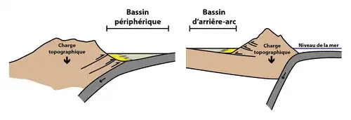 - Les bassins périphériques, qui se forment sur la plaque subductée pendant une collision de plaque (comme le bassin Nord-Alpin européen ou le bassin du Gange).