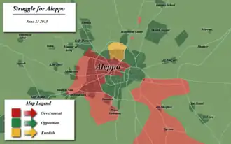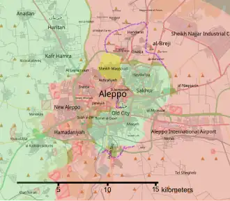 6. Du 27 juillet 2016 Double offensive loyaliste et kurde. Les Kurdes capturent Youth housing, puis atteignent l'autoroute. De nuit, les rebelles bombardent la centrale électrique d'Alep. Courant coupé, ils fuient du District Bani Zeid pris en étau entre loyalistes (ouest, nord et sud)) et Kurdes (est).