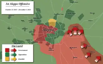 À l'été 2012, l'ensemble de la région au nord d'Alep passe aux mains de l'opposition. Les localités sont prises les unes après les autres ; Jerablus, le 17 juillet[25], puis Azaz le 19 juillet[26], Manbij le 20 juillet, ainsi que Marea et Al-Bab[27].