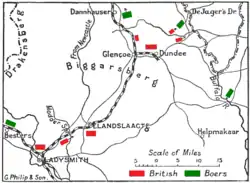 Arrivé peu après l'aube du 21 octobre, French trouva les forces boers en nombre, armées notamment de deux canons. Il télégraphia à Ladysmith pour obtenir des renforts, qui arrivèrent rapidement à proximité par le train.