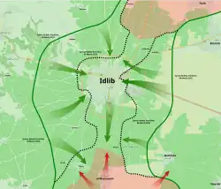 En , le gouvernorat d'Idlib est majoritairement aux mains des rebelles et le Front al-Nosra y est la force dominante depuis sa victoire en décembre à la bataille de Wadi al-Deïf[8]. Peuplée d'environ 100 000 à 200 000 habitants[9],[10], la ville d'Idlib reste quant à elle tenue par les forces du régime syrien, mais elle est presque totalement encerclée, à l'exception d'un corridor filant vers le sud[8],[11]. La défense de la ville est assurée par l'armée syrienne et les milices des Forces de défense nationale et des comités populaires[12].